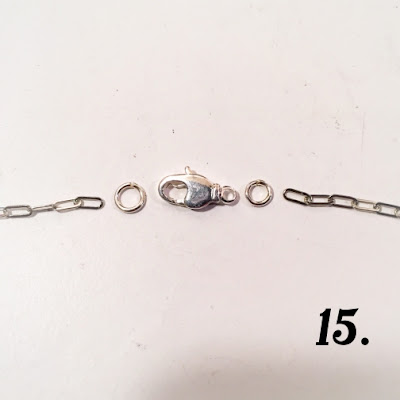 15. This image shows the assembly for the clasp. Chain end, jump ring, clasp, jump ring, and other chain end. Open the jump rings (see step 16 below) and thread on the chain ends and clasp in the order as shown in the photo and then close the jump rings.
