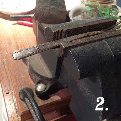 2. Secure the spoon or fork in your bench vice so that it stays firmly in place while you saw it. (I also have my vice clamped to my workbench so that it does not move around while I am working.) Determine where you want to cut. You can make a mark on your spoon with a marker if that makes it easier for you. I simply eyeball it and cut a little bit below where the bulk of the design stops.