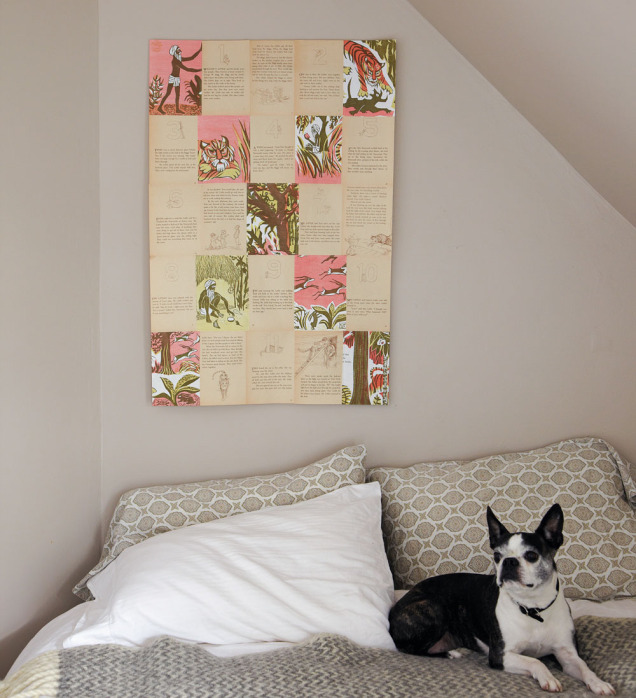 Birdhouse covered with pages from an old children's book. The roof is the book cover.